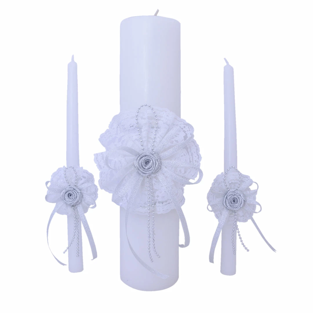 • white candles with white and silver trimmings